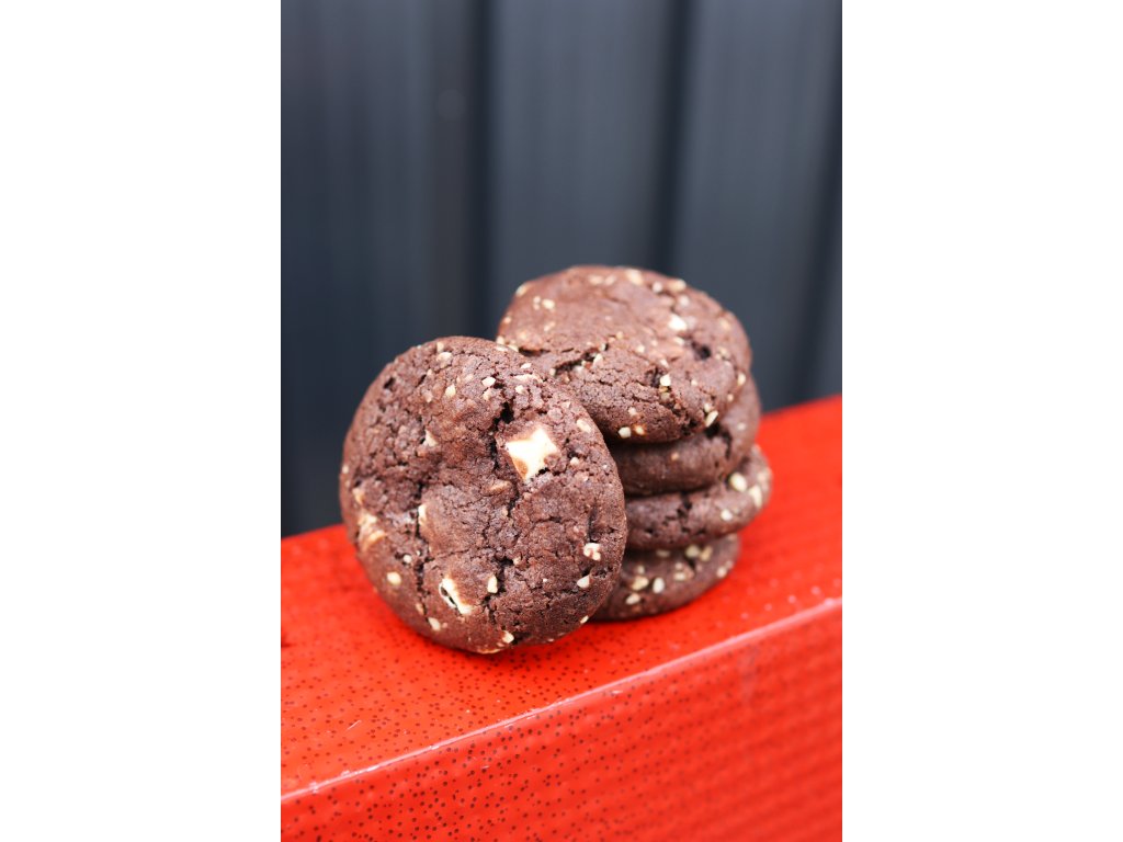 Složení: hladká mouka, kakao, cukr krupice, jedlá soda, máslo, mandle, bílá čokoláda, (cukr, kakaové máslo, sušené mléko polotučné, sušená syrovátka, laktóza, emulgátory, (sójový lecitin a polyglycerolpolyricinoleát), vanilkový extrakt Bourbon Madagascar)