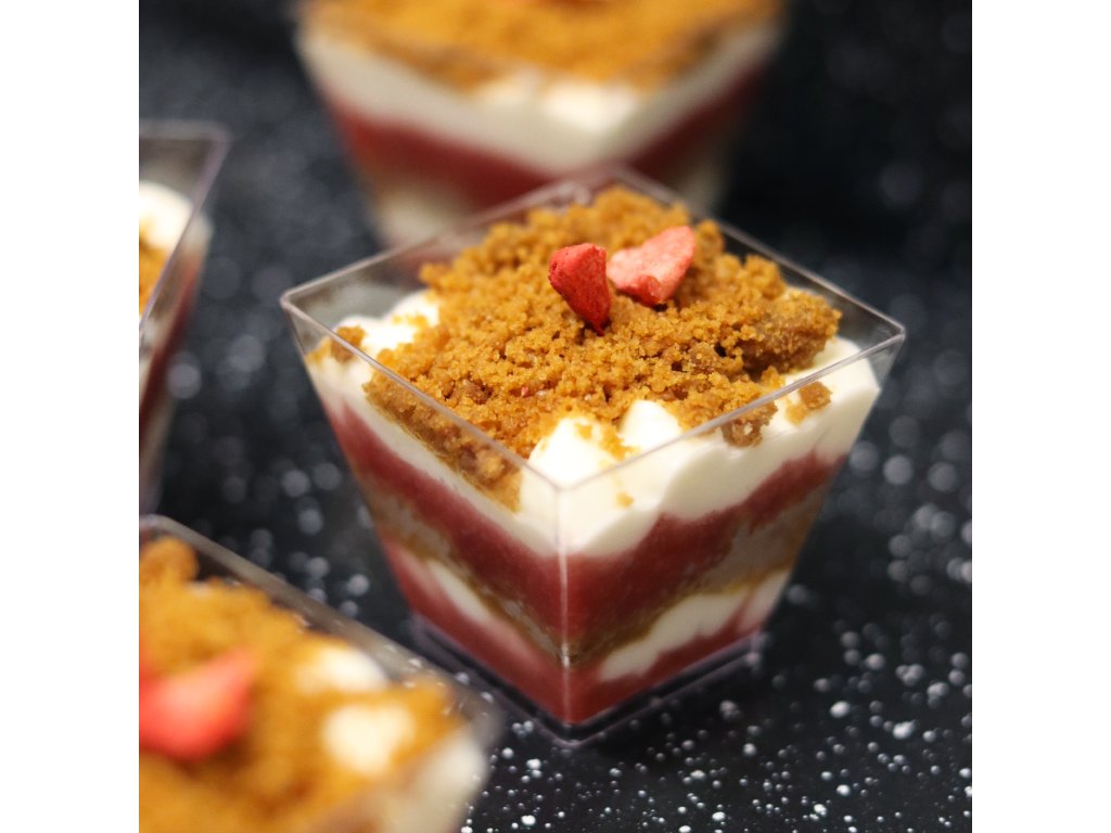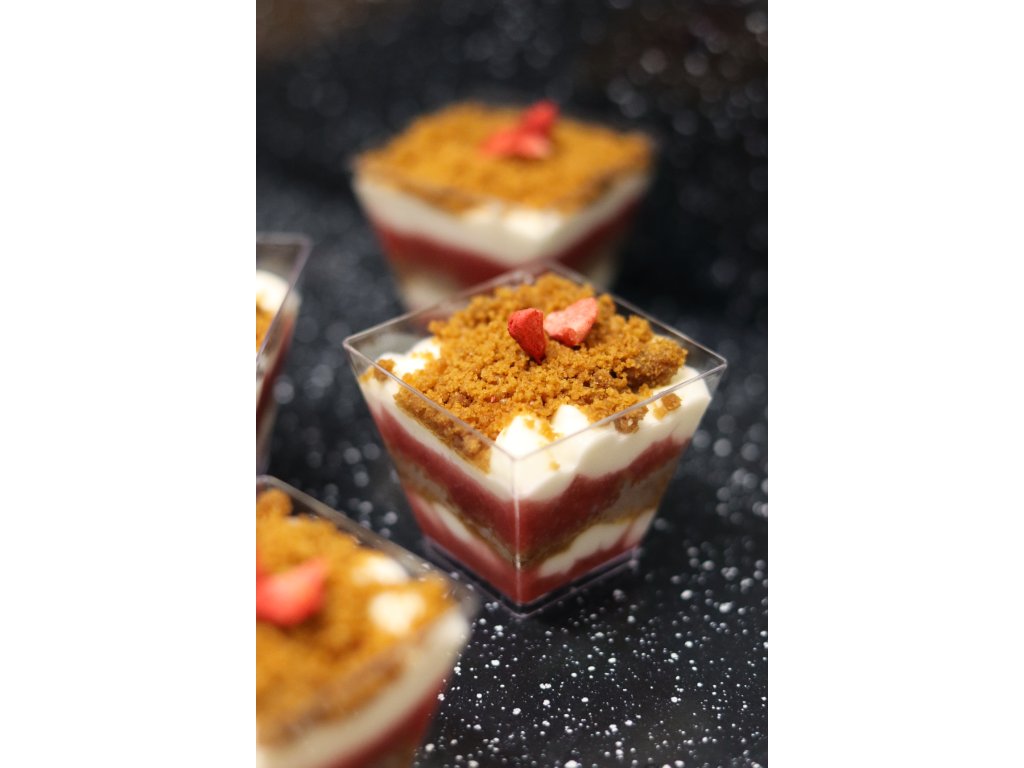 Složení: tvaroh (mléko, smetana, mlékařské kultury), smetana ke šlehání (smetana, stabilizátor: karagenan), máslo, jahody 19 %, směs sušenek se skořicí a kakaových sušenek (pšeničná mouka, palmový tuk, cukr, pšeničný škrob, sušené vaječné žloutky, skořice, aroma, kakaový prášek se sníženým obsahem tuku), cukr, bramborový škrob.