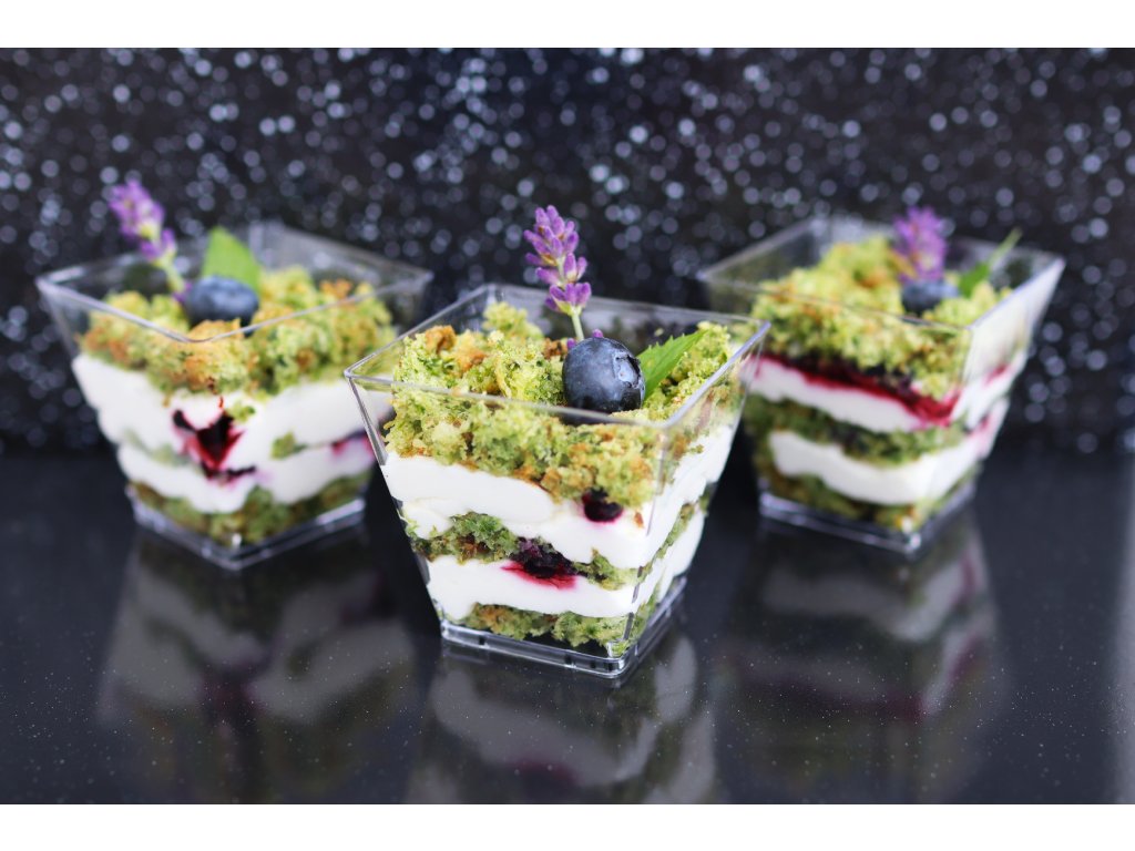 Naše mechová roláda akorát v kelímku a v mini verzi ideální na catering. Na jednu lžičku si naberete nadýchaný piškot ze špenátu, lehký krém ze šlehačky a zakysané smetany a čerstvé borůvky.