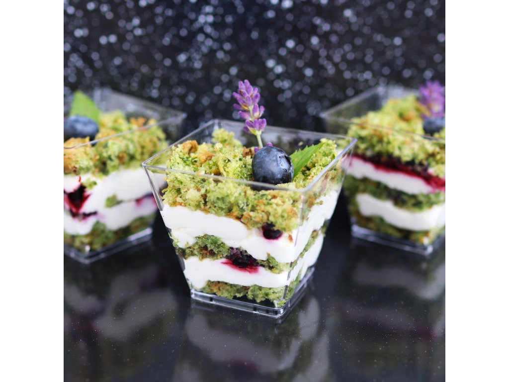 Naše mechová roláda akorát v kelímku. Na jednu lžičku si naberete nadýchaný piškot ze špenátu, lehký krém ze šlehačky a zakysané smetany a čerstvé borůvky.