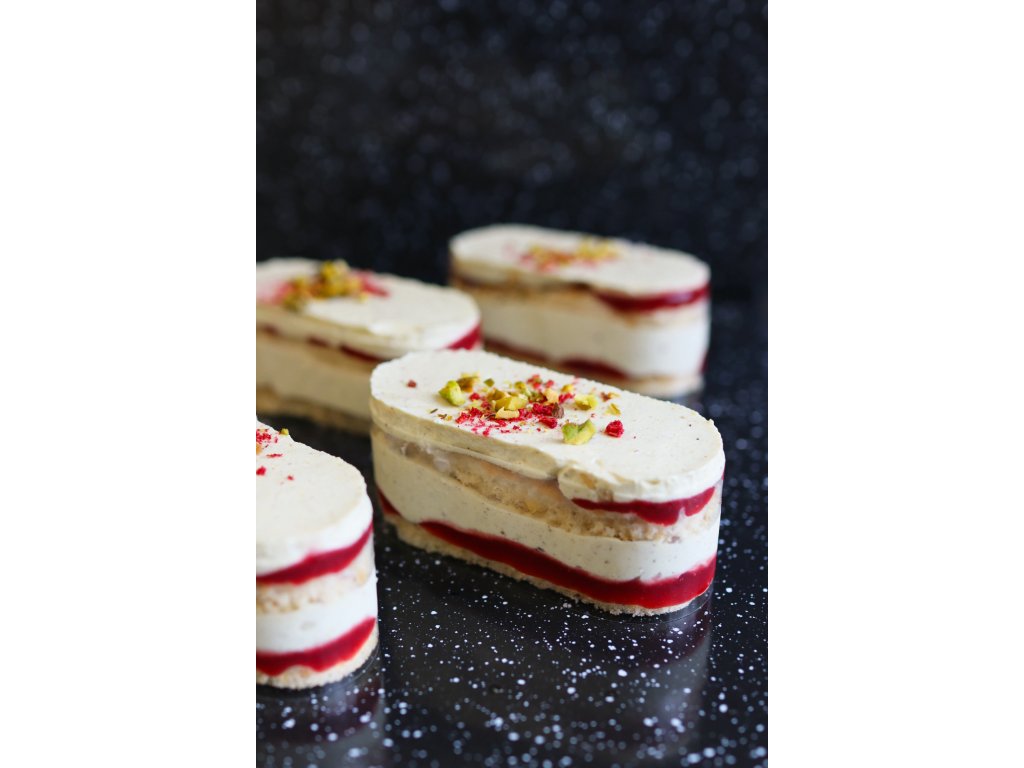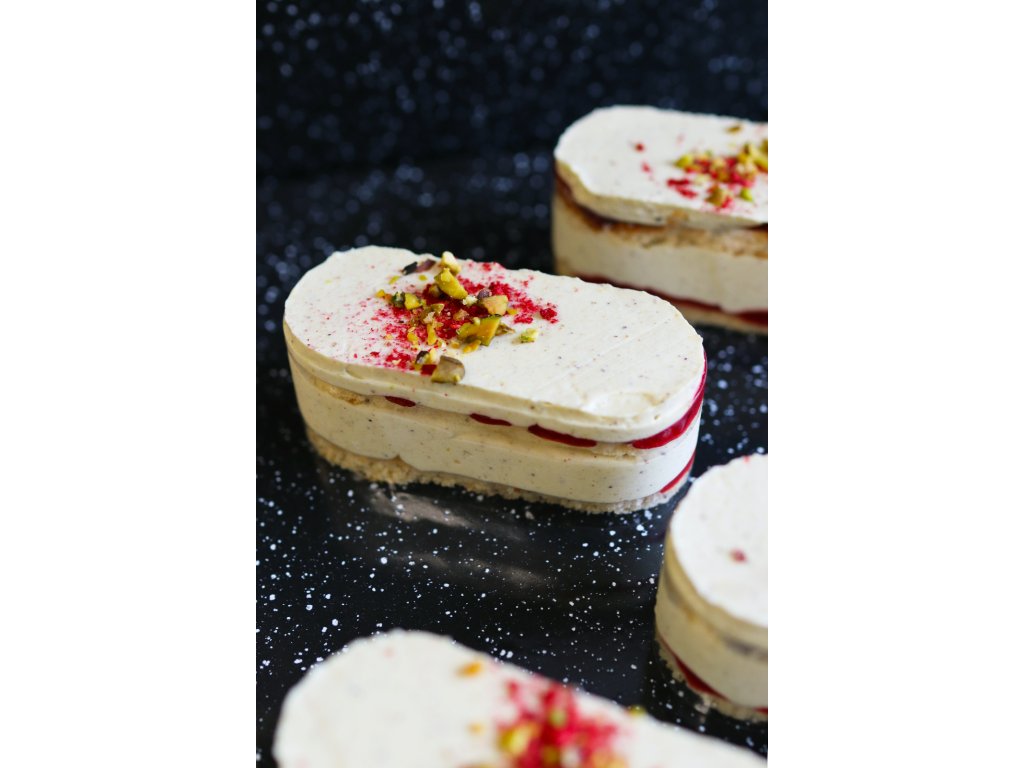 Složení: smetana ke šlehání (smetana, stabilizátor: karagenan), pšeničná mouka, pistáciová pasta 6 % (pistácie, dýňová semínka, slunečnicový olej, rostlinná vláknina, dextróza, sůl, emulgátory: sójový lecitin, barvivo FCF), pektin, malinové pyré (90 % maliny, třtinový cukr), lískové ořechy, kukuřičný škrob, glukózový sirup, cukr, bílá čokoláda (cukr, kakaové máslo, sušené plnotučné mléko, emulgátor, slunečnicový lecitin; vanilkový extrakt)
