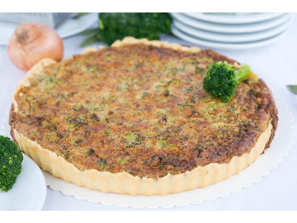 Slaný koláč s náplní z brokolice, nivy, šlehačky a muškátového oříšku.